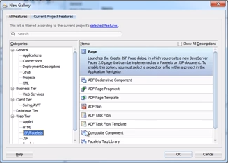 - From the New Gallery select Web Tier -> JSF followed by Page from the main pane: